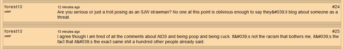 Getting down to what prompted the creation of the thread, I'm going to point out a history of comments from a number of users based on their profile pages, show just what kind of racism they are throwing. Before I start the list however, I'm going to point a few things: