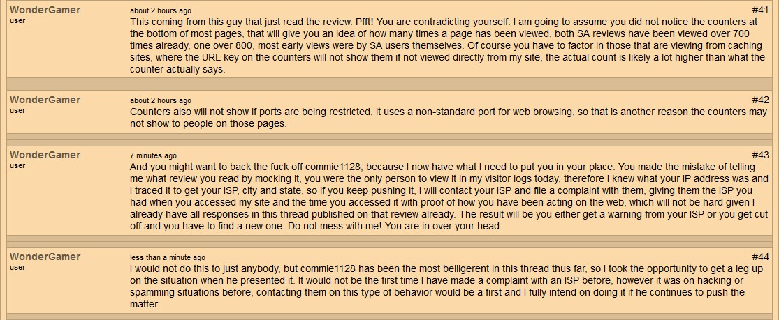 UPDATE: I checked the forums again on 7/27/2017 (going directly to the Racists thread last night through my browser history), come to find out the thread where the retaliation from commie1128 had been deleted: