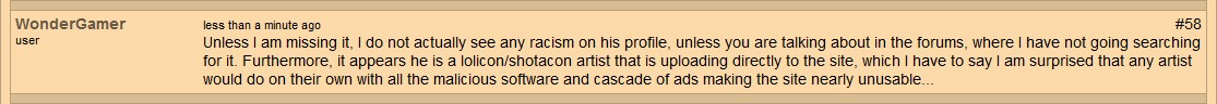 The 5th point is that this site has an obscene amount of abuse & racism getting throw around it, unrestricted by Rastafarian, which has allowed all hell to break loose & turning the site into one of the worst cesspools on the web. I had already lost all hope for the site when Rastafarian made it clear he didn't care what his visitors thought, didn't care if he was infecting their computers with malware & didn't care of people chose to leave the site in the dust because he had a hardnosed attitude that he wasn't going to change anything (with the exception of the Patreon bullshit, which I can't see makes a big difference anyways), but I took a chance in bringing the racism (more on this in the next section) to his attention to see if he would do anything about it. As expected, he had no interest in getting these racist lowlifes under control, but what shocked me was that he considered the racist comments "freedom of speech":