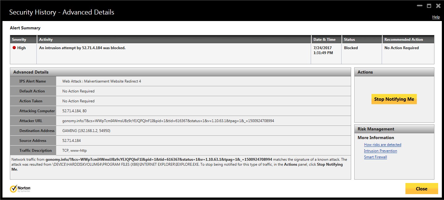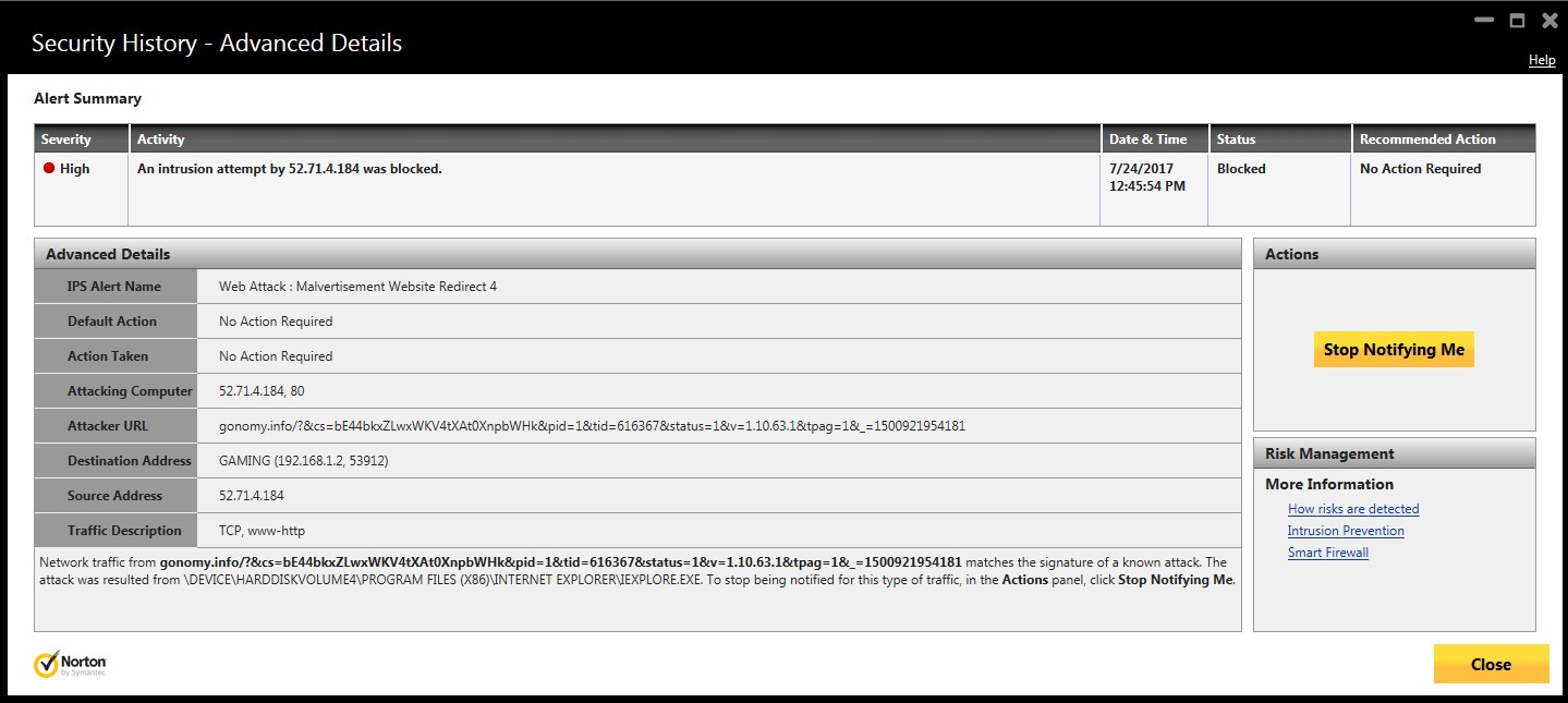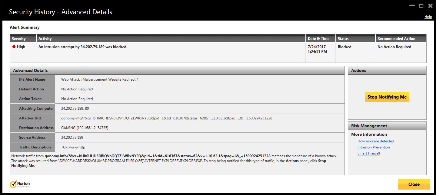Getting back to the matter at hand, I ended up having to use Internet Explorer to gather evidence for this review of the site, ever single time I loaded a new page (sometimes twice), I would get the following alert from Norton Internet Security in the bottom-right of my main monitor: