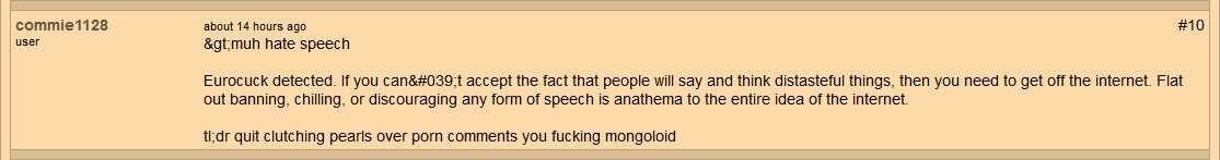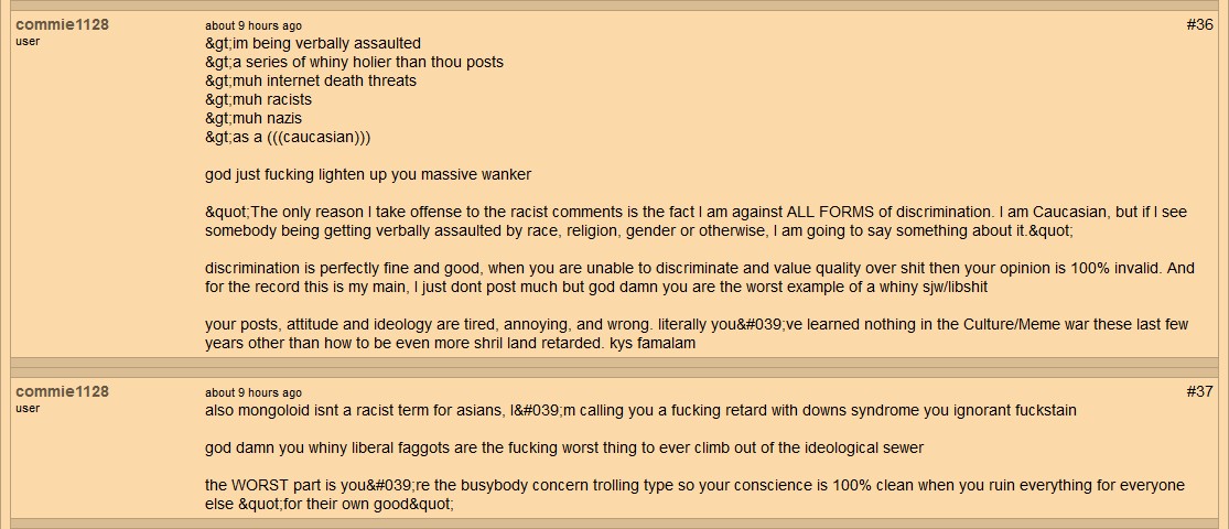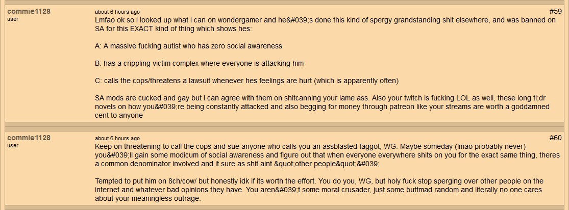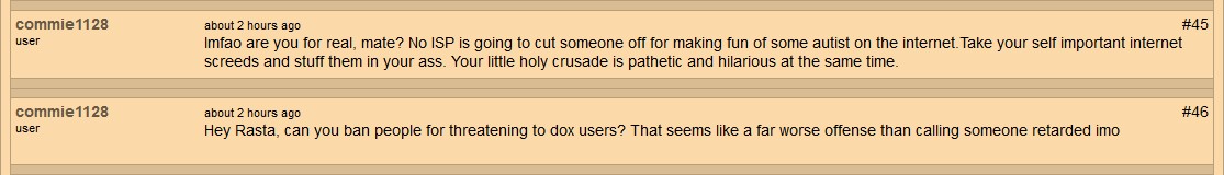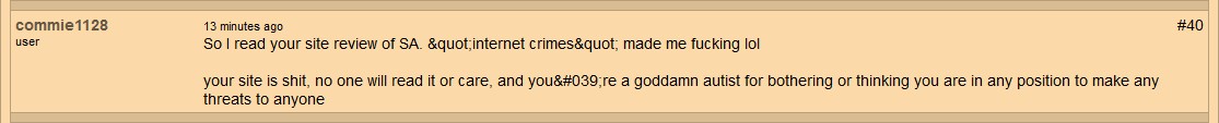 UPDATE: On 6/27/2017, I had noticed the webmaster had deleted the thread where this abuse from commie1128 was happening, seems he got tired of it (and the publicity he was getting on his site as a result of multiple daily updates to the review of that site because of it) & finally decided to do something about it. I can't see that commie1128 received any type of punishment for his public discriminatory rage-fits (his profile appears to still be active, however I'm not certain how bans are handled on that site; I honestly can't say for certain whether the webmaster even bothers with bans), but I expect he's still on this same ISP, pulling the same shit & unless Cox Communications decides to do something about it, it is unlikely this lowlife will ever stop his extremist outbursts across the web...