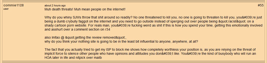 When I contacted his ISP to make the complaint, they were making it clear they wouldn't do anything without the police getting involved, they stated that I needed to call the police. I didn't particularly see the police doing anything about it unless it involved a death threat, so I decided not to take that route. Instead I decided to write this review, showing how the ISP will not penalize their customers for acting poorly over their service & I think the unfortunate thing about that is they also won't do anything if they are doing anything illegal, which in all honestly if I wanted to go that route, I could point out that the site this abuse was done on has underage hentai on it.