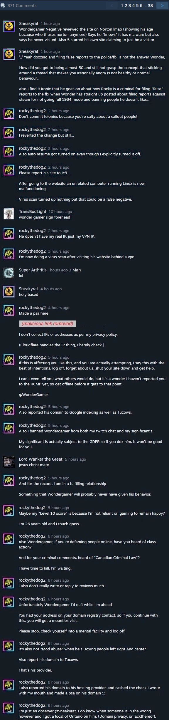 Needless to say I will be reporting every single one of these posts that is obvious targeted harassment through the posts themselves, reporting the users giving a link to the thread of those posts & likely be opening another support ticket naming this user specifically. Shouldn't be surprising they are now considered one of the highest contributors to the targeted trolling, internet stalking, online harassment & doxing efforts coming from Steam & I will likely be making another attempt to file another police report with my own local police against Steam & this particular user (not to mention I think another Internet Crimes Complaint is in order & maybe a review detailing Steam's lack of action to organized harassment on their site through the Better Business Bureau). I will also be adding any site that he is using in his publicized organized harassment to the Virus Site Blacklist, in addition to posting additional reviews to security suite sites on those domains (detailing personal experience on how those domains are being maliciously used by this individual).