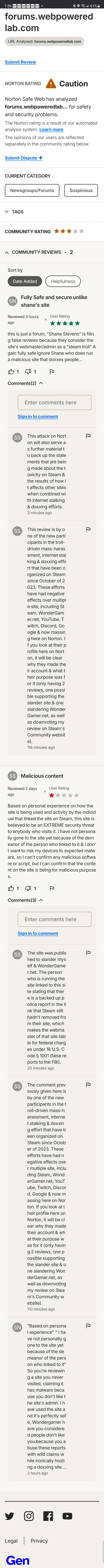 Remember I had to verify my ownership of WonderGamer.net to file the appeal on the previous misclassification (marked as such primarily because it wasn't a known site until it was already up for several years). Norton is already aware that the person that left the first review on Norton was by the webmaster & they didn't stop it from happening. Granted, this wasn't exactly public to other users, but I haven't been hiding that fact & have been addressing the defamation as it is made (and will continue to do so as it continues, same as in continuing to publish the ongoing harassment as evidence as to the claims of a dangerous social hazard on Steam).