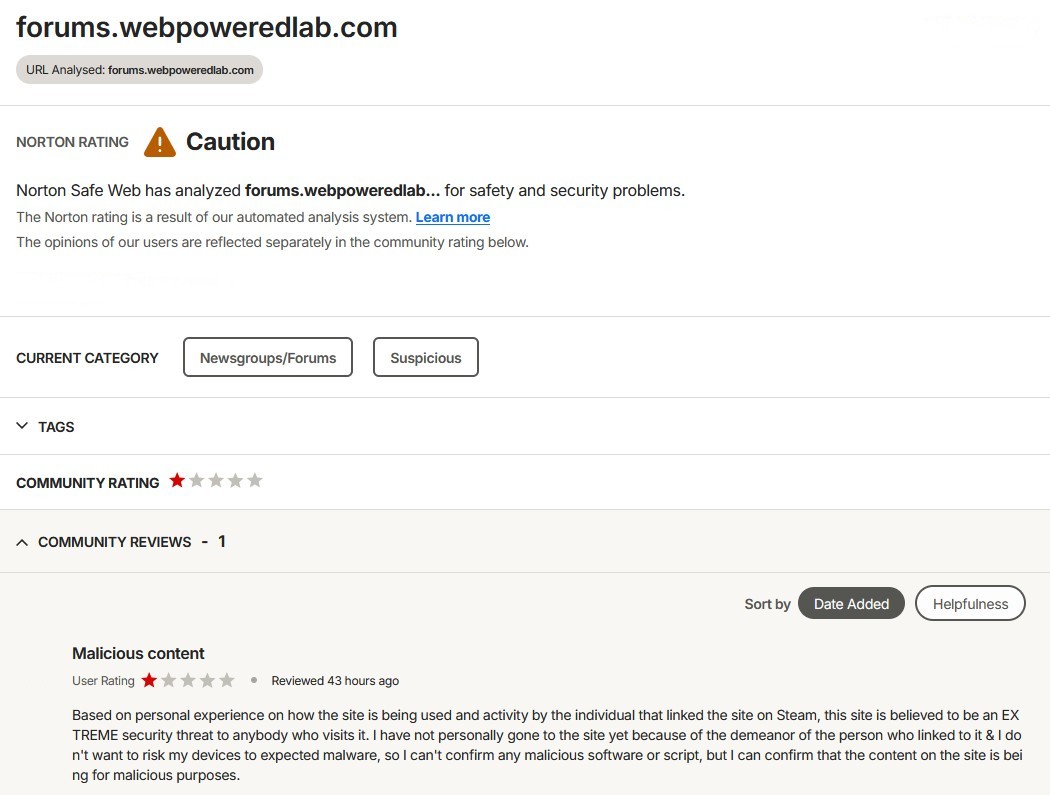 Going back to bullet 2 of this section, remember that I pointed out I had to verify my site as the owner to appeal a miscategorization of WonderGamer.net on their site. Given I believe rockythedog2 is likely running his website through a free forum service, I suspect he won't be able to go through the same steps I had to go through to verify ownership of his site. Also remember that the classification was made by Norton after they analyzed his site, so the security threat classification & tagging didn't come from me, I only pushed it to happen a bit faster when I submitted a review of the site based on "personal experience" (that being the conflict with the user when they shared a link to that site on Steam). Even if the site manages to get a positive rating (should Steam trolls make it a point to create accounts to raise the score of his site), that doesn't mean it will remove the "Caution" rating, because that determination comes from Norton's analyses of the site. I already believed the site likely had malware on it, although I wasn't certain it was a security risk until Norton classified it as such & I'm clearly going to trust Norton over a group of aggressive anarchists that have been targeting me for years.