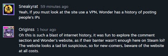 First is the obvious, the claims of malware on this site. The first 3 comments made in the screenshot (Steam comments are inverted from most forums, most recent on top) is again baseless accusations they are not provided evidence of, just statements they can't back up.