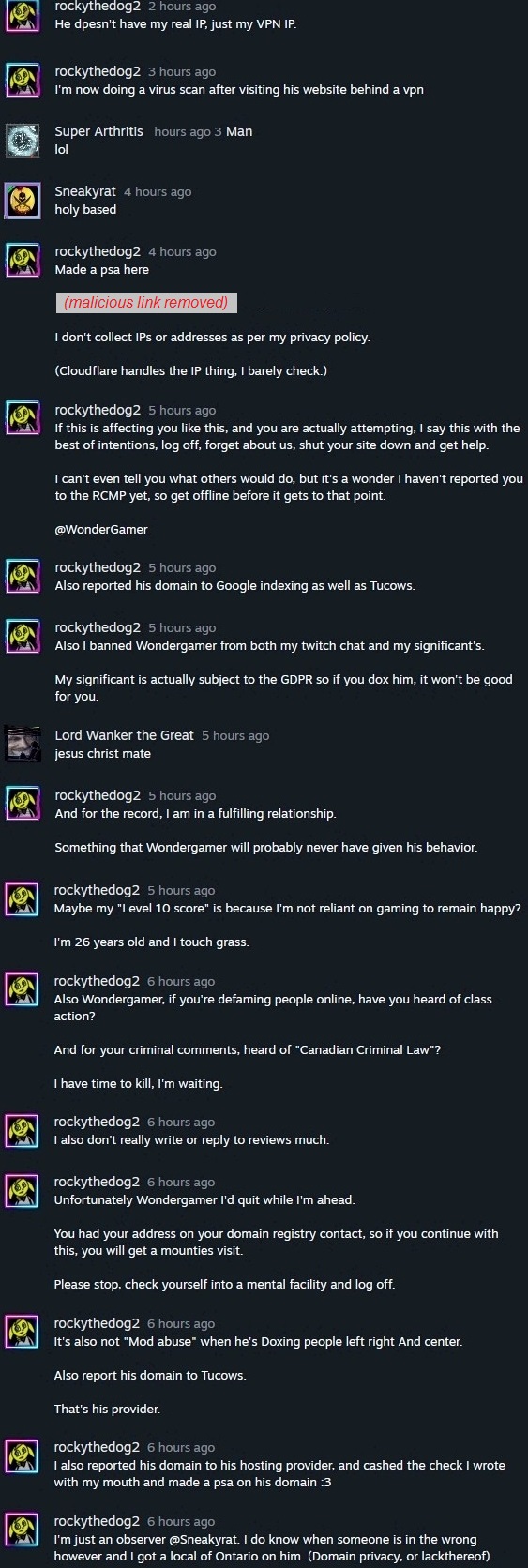 The follow-up rant after the update published yesterday shows that they are now getting desperate because they realize their actions have now put their own domain at risk for termination (provided my reports can get past cloudflare protecting it from valid abuse reports getting to their hosting service). It also shows they are trying to coordinate more attacks from other users on Steam to aid him in getting himself out of the corner he just put himself into, which means more evidence of organized harassment through this same thread (an ongoing issue for nearly 2.5 years).