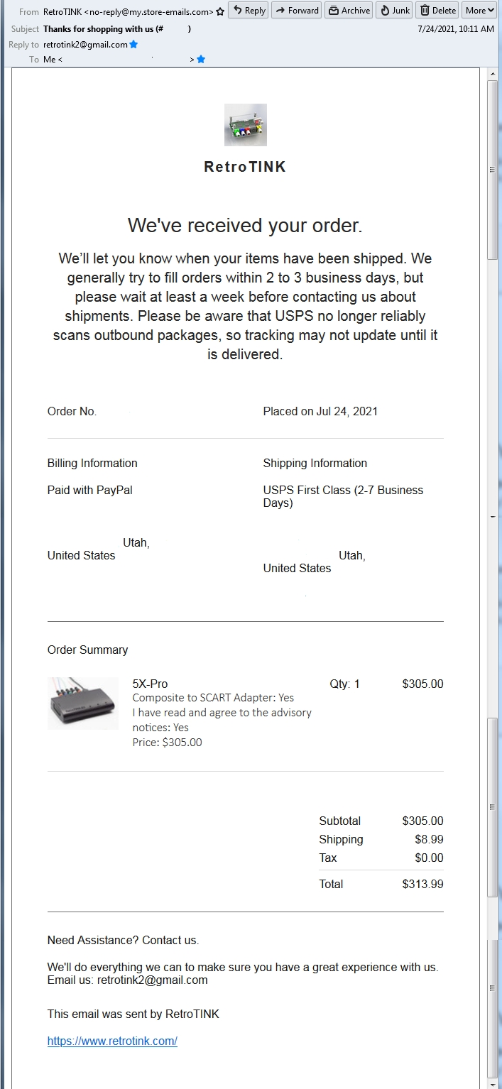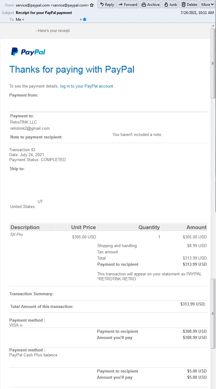 On 7/24/2021, a friend of mine contacted me & asked me to order a RetroTINK 5X-Pro for him, him knowing that I had a PayPal account only for use with my Twitch channel (closing my other account when I closed my eBay account because I got tired of dishonest sellers on that platform). I had to get my credit card set up in PayPal to even make the purchase (seeing as it was only set up for receiving money in the form of tips through Twitch, not set up for payments & I didn't want the money coming directly out of my bank account), but eventually got it set up & made the purchase on the date that my friend indicated at the time indicated (having to get up early as that friend stated that these things sell out fast). While I struggled with their site, I did finally get the purchase to go through at a whopping $313.99 for the purchase of the device, as well as the SCART Adapter.