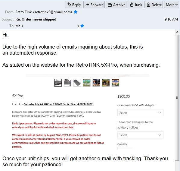 I got (what appears to be) an auto-response from RetroTINK roughly 3 hours after the attempted contact regarding the non-delivery of the item, followed by what looks like manual response: