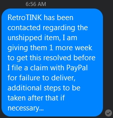 Let's back this up here for a second. Under PayPal policy, filing a claim is the way to go about it when something has been stated as a part of the transaction is not followed through with, so this is the correct method when a company/individual looks like they are not going to deliver on their side of said transaction. RetroTINK chose to escalate the statement into one of being a threat, which in all honesty, I can only see as manipulation to not have to deal with my purchase (which isn't much different than some of the issues I've had with rotten eBay sellers that ultimately lead to my closing my own account so I wouldn't have to deal with those sellers anymore, ironically this same friend being a big part in the decision to close that account due to orders he was running through me, as well as most of the reviews published to the eBay seller blacklist on this site).