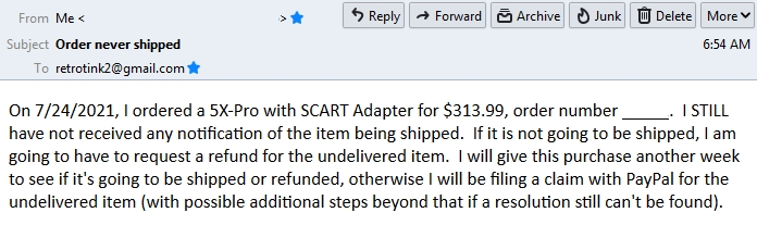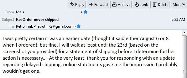 It was as I was finishing up this response that my friend finally decided to call me about the message I had sent him earlier over Facebook, apparently worried that I had stated to them that I would be filing a claim against them if not delivered. I stated that while I didn't fly off the handle on it, I did in fact state that I was intending on filing a claim if not delivered in a week. I continued to detail the response from RetroTINK to state that it could be shipped as late as the 22nd & I responded that them I was willing to wait until the 23rd before I decided any additional steps would be needed. In either case, I didn't think there was any need for concern because we still had until the 22nd (12 more days from when I made contact) & expected it would be shipped by then, so it was expected to be resolved with plenty of time to spare.