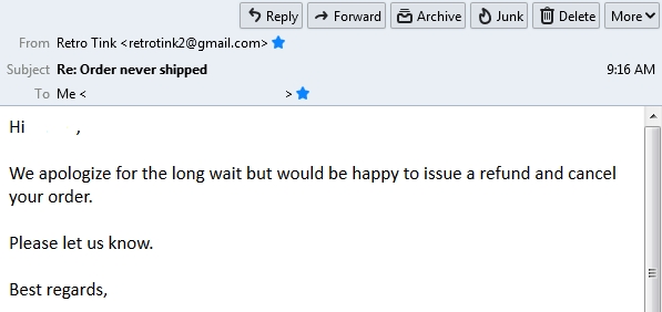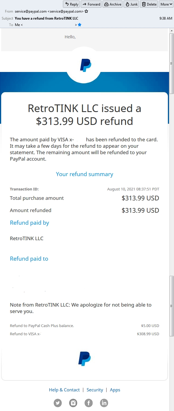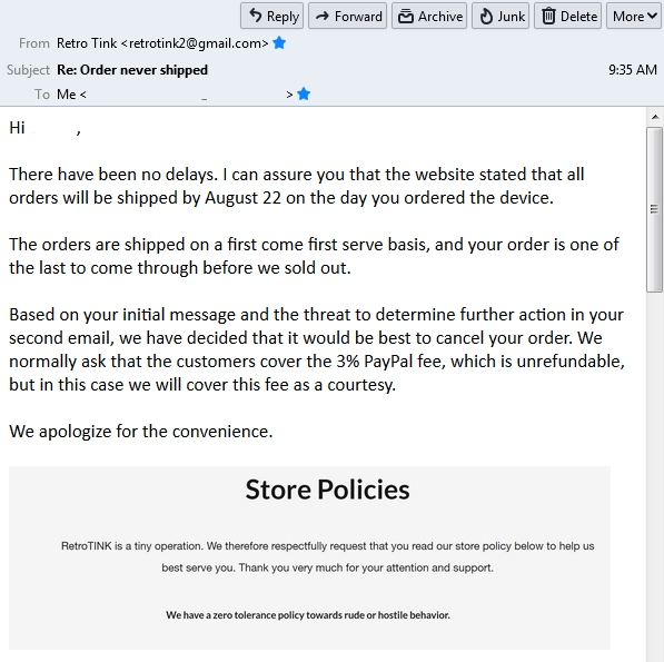I considered contacting RetroTINK back to let them know that if this was their decision, I would be publishing my first experience with their site in a review. I almost had this response to their email completed before I ultimately decided there wasn't any reason in contacting them back again; they had already made their decision, letting them know I intended on publishing a review about it wasn't likely to change it & contacting them again would likely just result in further retaliation (which has already been stated in the complaint that was already made to the BBB, as well as proven in my own experience). Ultimately I felt it was just better to have write the review & publish it once I made certain that the entirety of what we should be getting back was refunded (expecting that if I published the review prior to getting the full refund, it would just result in more retaliation against the pending refund), this was a detail that was going to need to be added to the review anyways if they didn't pay the transaction fee as they stated they would.