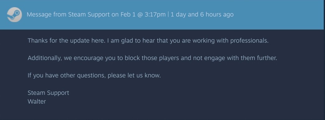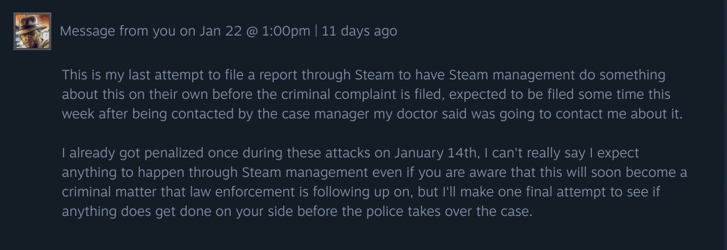 Ultimately the lack of action that this situation still stands on holds my stance of the dangers of being a customer of Steam, especially when it can start on Steam & extended well beyond their ability to even put a dent in the escalation of the actions of their most toxic users (especially if they don't act on it quickly when a report is filed).