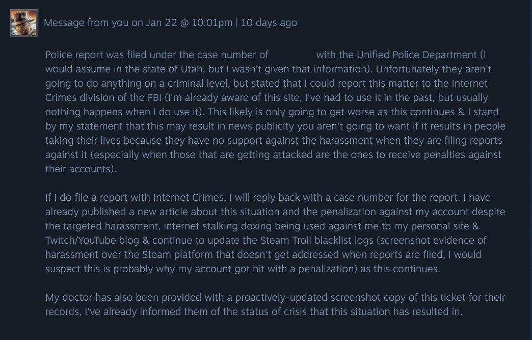 On January 22nd, I ended up contacting the police regarding this matter (this was a rushed decision due to a statement of organized attacks against this site in the thread where this started, no longer willing to wait for aid from the case manager my doctor said they were going to get me in contact with). This very much ended up being a wasted effort, but I was given a case number, which was supplied to my doctor & to Steam Management through their support system (opening a support ticket with Steam regarding the thread where this mass-abuse is being organized before contacting the police). Of course even after the reply from Steam Management to that thread, I couldn't see that they were doing anything in regards to the clear organized harassment & discrimination being stated in that thread.