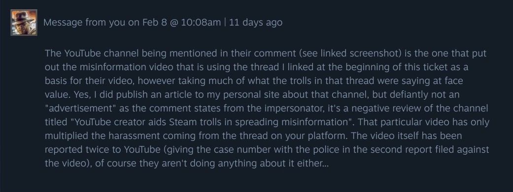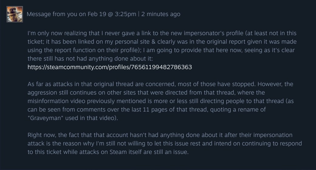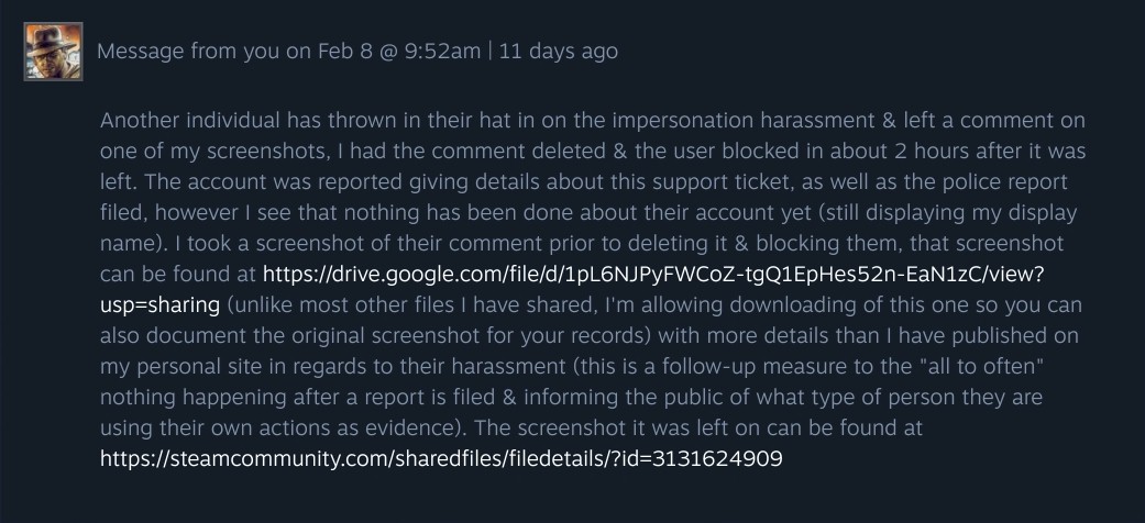 In the case of both accounts that were given to the support representative regarding impersonation, they were both eventually taken care of, but reporting them through their profiles yielded no results, which is why this had to be forwarded through a support ticket & likely still wouldn't have seen any results if a police report hadn't filed & that case number referenced in the support ticket. The ticket was ultimately closed after the last post displayed due to a lack of new updates on the matter (nothing new to report because the attacks seemed to have stopped or at least went silent on Steam itself, I couldn't really expect Steam to do anything about the management-supported attacks that were happening on YouTube).