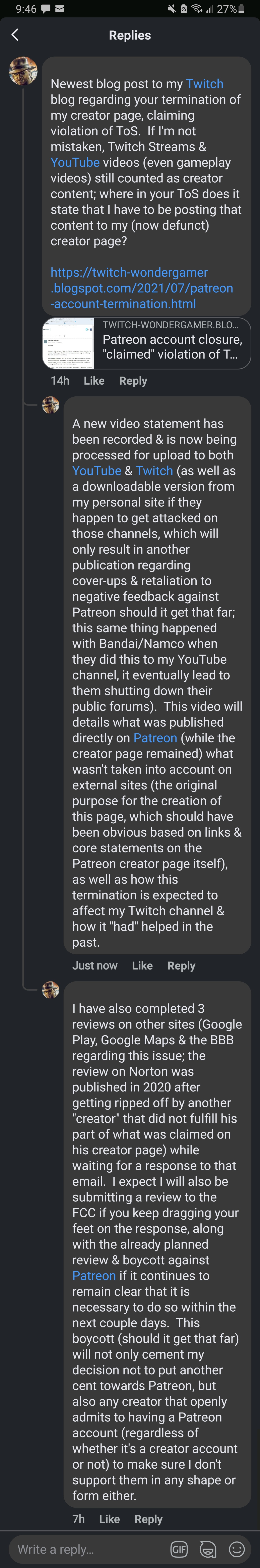 The screenshot of these replies above show everything up to the last post that gave a link to the video response to the account termination (too tired to remember to make another backup of the posts before going to bed). The video response to Patreon's actions was as follows: