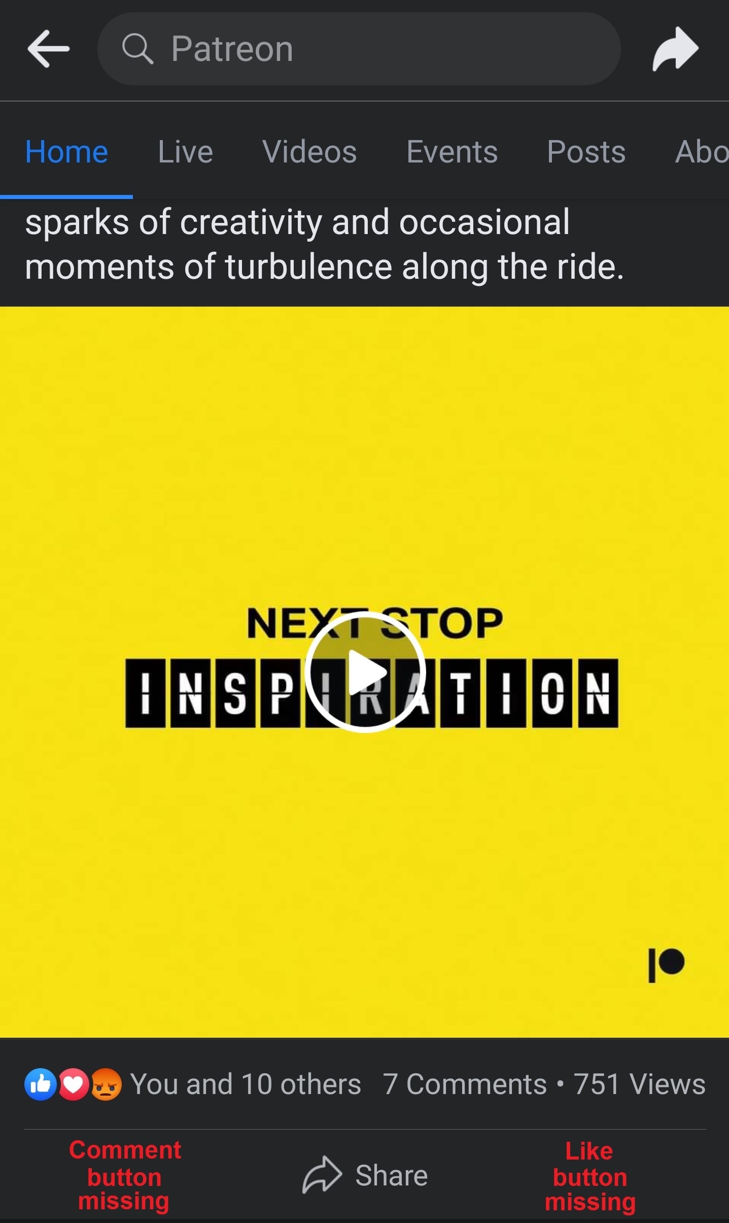 By morning on 7/22/2021, I found that Patreon had retaliated to the comments on their Facebook page by not only deleting those comments, but also blocking my account from being able to make any additional comments to the page or leaving any reactions: