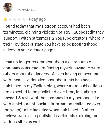 Of course by allowing the download, Google Play allows the developer of the app (in this case, Patreon) to acquire information about you not only from your Google account, but also your phone. This seems a necessary negative that the Google Play platform allows if it meant getting Patreon's attention on their incorrect actions, as well as to warn others about their victimization of creators before they attempted to download the app, also giving Patreon their information through the same terms that Google Play allows. Of course I knew the review was likely to get deleted anyways (as has been many cases in the past on reviews I have attempted to submit on Google Play, almost a definite reaction to negative reviews every time it happens on the Samsung Galaxy store), so I make a habit of keeping backups (text versions for resubmission to those apps if removed & screenshot versions for republishing to this site if it gets removed too many times).