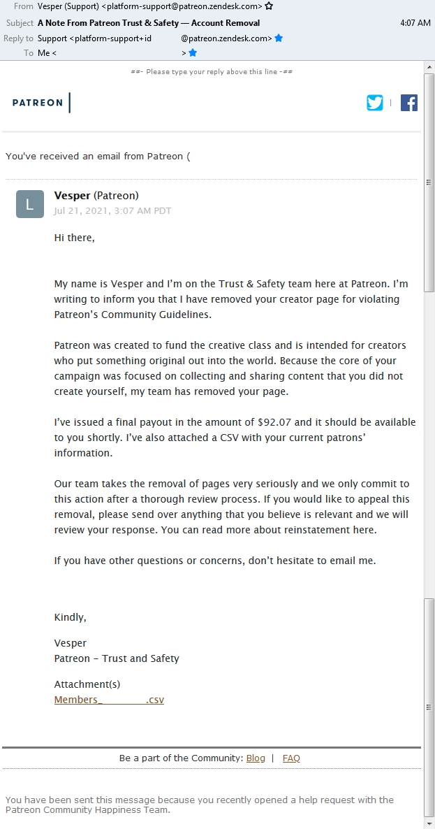 On 7/21/2021, I received an email from Patreon stating that they were deleting my creator page (this came minutes after receiving an email about a forced payout, which at first had me believing that my account had been compromised, which I found odd as it's authenticator protected, so I was about to log into Patreon to see what was going on), claiming a violation of ToS for not providing my own creator content: