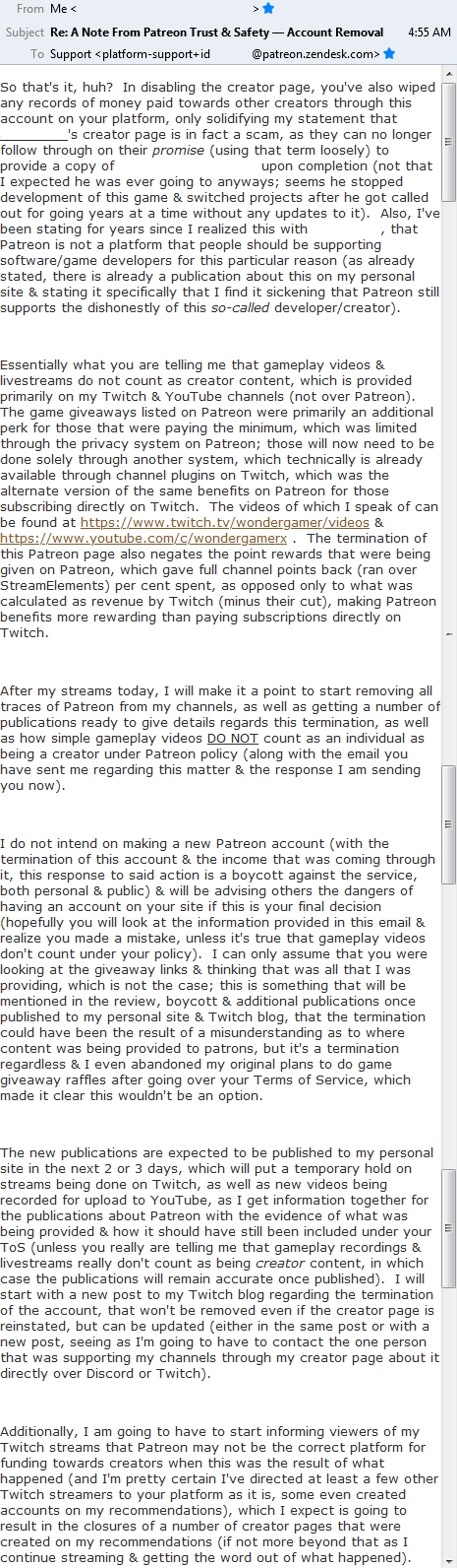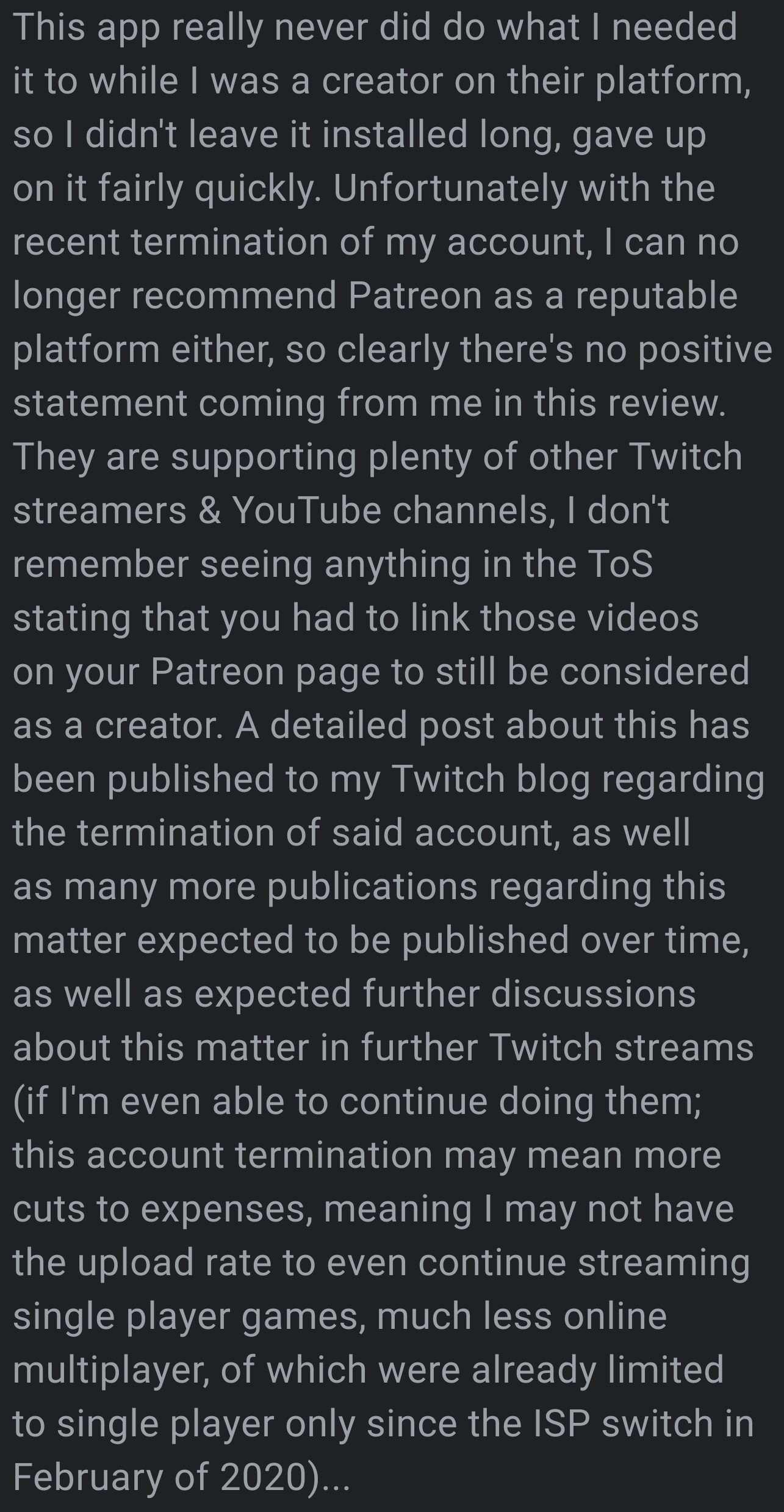 While I can somewhat understand that I probably wouldn't get a response to this type of reply to their termination email, I did decide to wait for a reply to see if they were going to reverse the decision, however rather than going back to streaming on Twitch (which was my original intentions that morning when I woke up, getting sidetracked by this whole Patreon victimization situation & not streaming for a few days after that while I got details together for the publications here if not reversed, as well as wasting some time writing some reversible reviews while waiting for reply, "reversible" meaning that I had the ability to delete them if they did reverse the decision of termination).