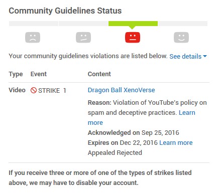 I got my first violation on 7/11/2016, in response to a complaint from Bandai/Namco directed at a stream of Dragon Ball XenoVerse. At the time the reason was unknown, but it became obvious after the strike on 9/23/2016 that those strikes & violations were coming from Bandai/Namco in retaliation to a mostly negative review on the game, where a link to that review was in the description of the review. This caused the stream to end prematurely & the account to get locked up for the most part with very limited functionality remaining (at the time, I made an announcement that no new videos was going to be uploaded to the channel for 6 months, when the false violation expired. The first violation got reversed after appeal on 7/12/2016.