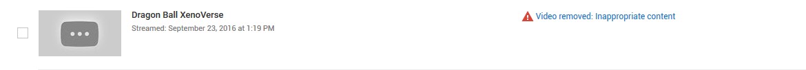 The second incident happened on 9/23/2016, where a strike was issued once again on the stream page (set to expire 3 months after it was issued), however this time there was no active stream (no video) & appeared to have only been targeted due to the link to the review (or possibly the thumbnail, which was a Dragon Ball XenoVerse wallpaper), which was unchanged from the violation on 7/11/2016. Additionally, streaming was disabled on the account, but this didn't matter much as it was already determined I wouldn't be streaming gameplay to YouTube anymore after the incident on 7/11/2016 (there was plans for private, non-profit, activist streams, however nothing had been streamed to my YouTube account since that incident). I didn't find out about the strike until the 24th, when I was attempting to verify an XCOM 2 video I had exported from Twitch. The email I got claimed a video had been deleted, however there was no video I could find except what appeared to be a bug (video stuck at processing with the same title & thumbnail as the stream used to have before it was disabled due to this strike) which placed the video in the Video Manager around the date of Feb. 15-16, 2016, which I know isn't accurate as I was streaming a non-profit movement against indoor smoking/drug use in the South 67 Condos to YouTube at the same time I was broadcasting that game to Twitch. An appeal was filed on the 25th, however it appears this appeal ended up getting flat-out ignored.