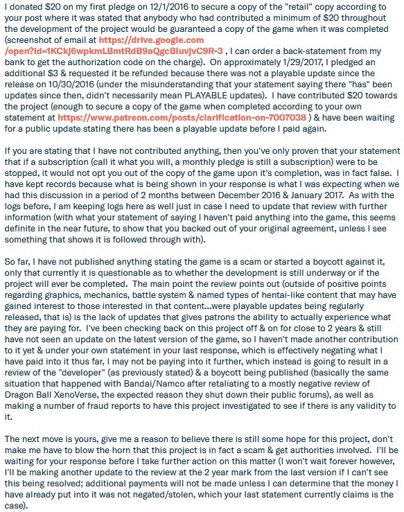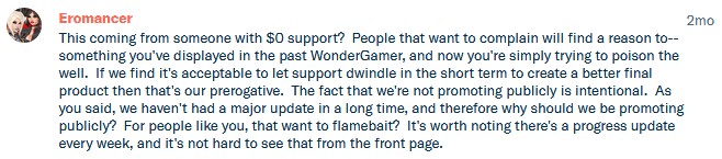 The expectation of this comment was it was going to get fully ignored (as has been the case with a number of other comments left trying to confirm whether the project was still in development & hadn't been abandoned), but the first response to it was actually supporting the comment, where the next response was abusive retaliation to it (which probably wouldn't have happened if not for the supporting comment being made first). After this review was was mentioned in a follow-up response to the aggressive retaliation to out comment & the supporter of it, Eromancer himself decided to weigh in on the matter, claiming I had not paid anything into the project thus far: