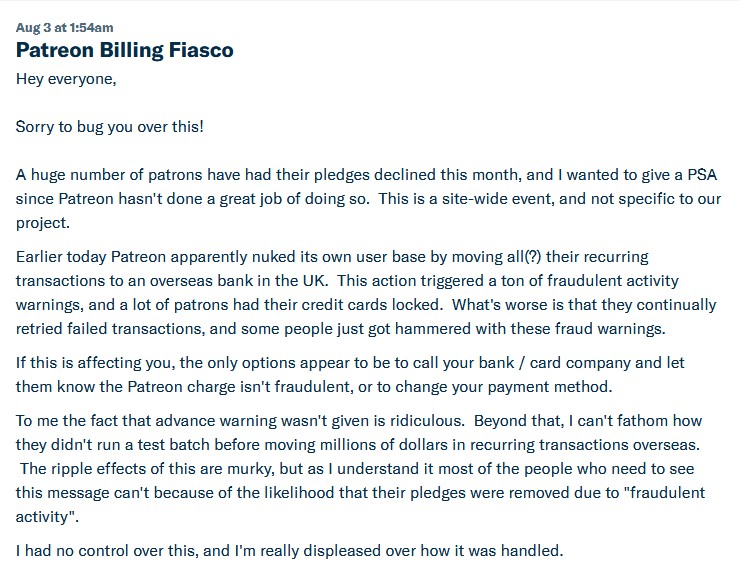 On 8/3/2018, the developer of this game made a new public post to their page calling out Patreon for nuking most of their subscribers as a result of switching to an overseas billing company (which resulted in mass-fraudulent false-alerts getting sent out by banks & those monthly charges getting blocked/reversed):