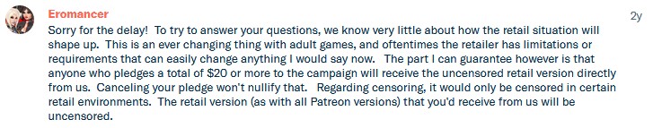 In the event that something does happen to the Patreon page down the road, I'll be backing up records each month so that I can still fulfill my end of the $20 uncensored retail version reward to those patrons that have met that requirement (in such an event, you'd receive a link to the game via email once it's completed).