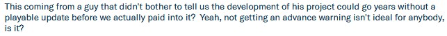 We left a comment on that post quoting the developer regarding the "lack of warning" when it came to the change of billing method, which turned the comment around & stated that it was unfair to those paying into the project that there was no prior warning that the project could go years without a playable update: