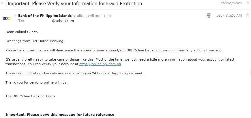 | 035.245.148.179 | 12/04/2019 | Email received stating that my accounts were going to be deactivated with a bank that I don't bank with, the contact link in the email was spoofed to look official, but lead the the IP address of 35.245.148.179. |
