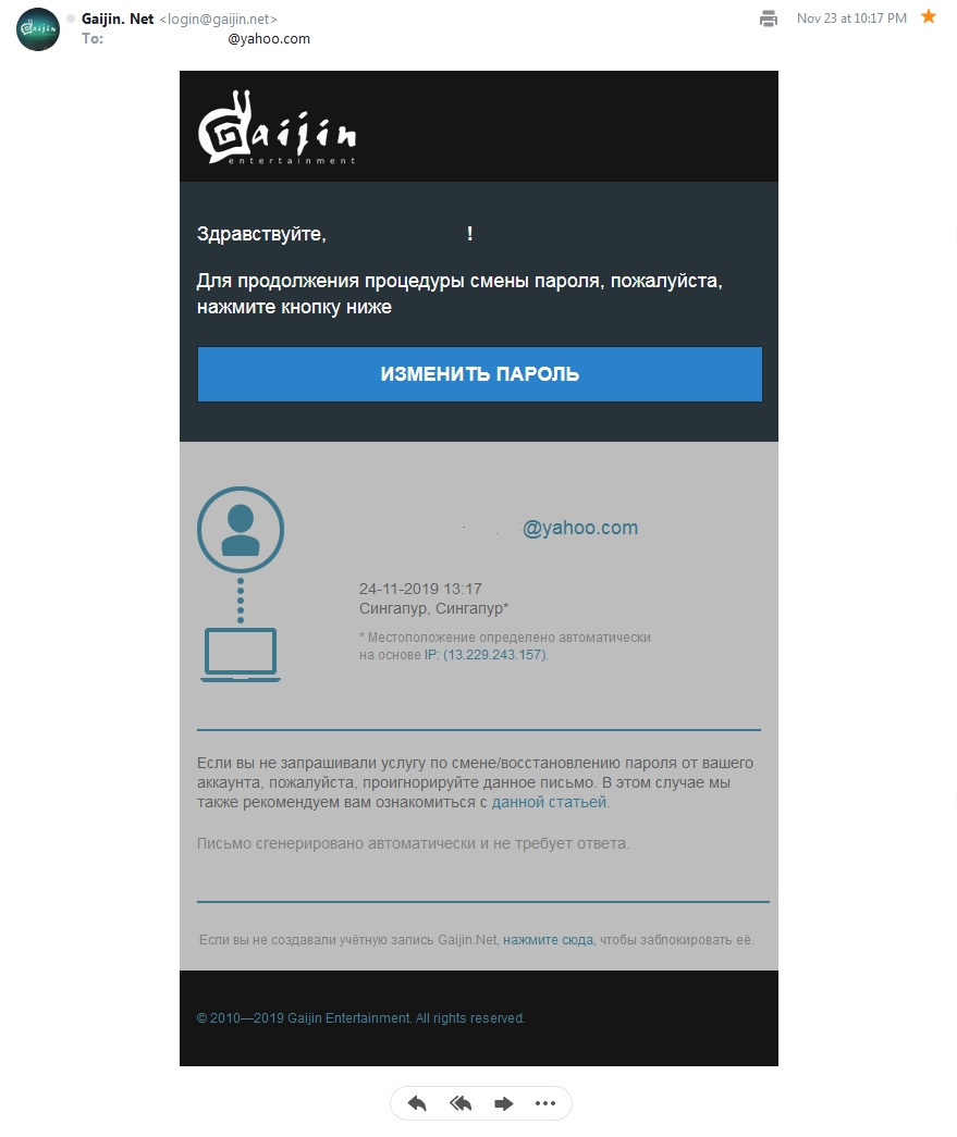 | 013.101.046.206 | 07/14/2022 | Successfully synced data from my email account using a transfer protocol used by email apps/programs. Password had to be changed & all active sessions ended, logging back into all my own devices afterwards. |