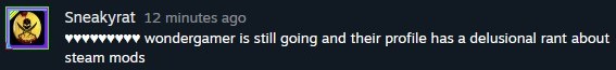 It does appear that the majority of this harassment seems to have stopped in the thread itself, this came after this issue was reported to the police on February 22nd (as well as the shared folder that contains the backed up IRC logs from my Twitch channel that has already been linked on this page). It's expected something may have happened through Steam management at this time as there was an open support ticket when the police were contacted & after supplying Steam with the case number for that report, most of the direct harassment in that thread stopped (for the most part). Of course I knew this wouldn't be the end of it, they continue to do so quietly (of course there is occasionally a new comment dropped into that thread that clearly has NOTHING to do with the game it's reviewing), although as with is the case with troll, being silent in their harassment isn't anything they are able to do well.
