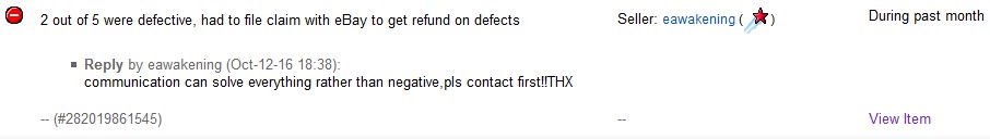eawakening is a user that we frequently purchased SATA to IDE adapters from, which often had a small portion of the order being defective, but in the last order we made, it became particularly problematic to get the refund back, even through the offered refund was accepted the following day. The refund stalled from Sept. 26, 2016 (when the refund amount was accepted, 1Ē less than what it should have been) to Oct. 11, 2016, when it seems I wasn't going to get the money back from this seller & opened an eBay claim. What led up to this is detailed below: