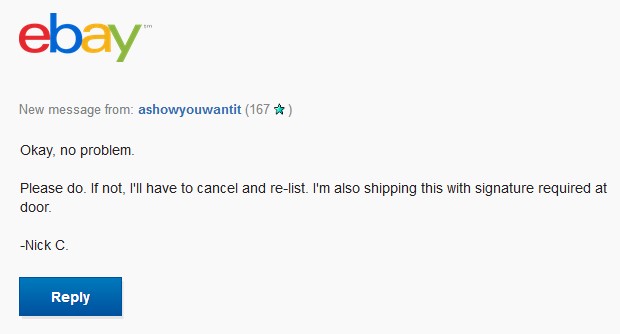 He responded again at 3:22 PM, this time threatening an early cancellation & re-list: