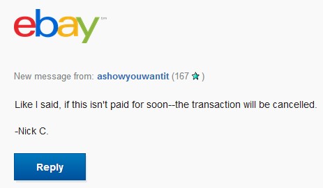 Only 8 minutes after the order was placed, I got a message from the seller showing just how impatient he was: