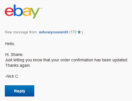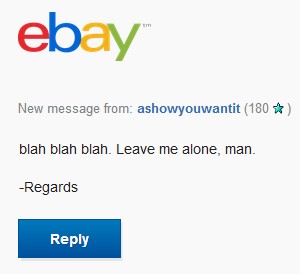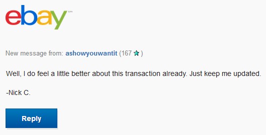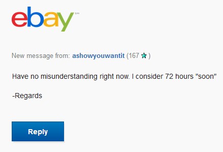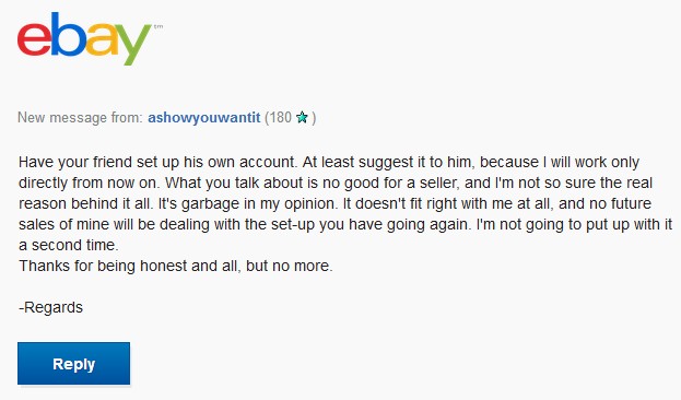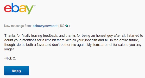 It seems that he may not have read the entire message however, stopping after the first paragraph before sending the last message, later taking the time to read the details regarding what happened with the last seller & what I stated about eBay policy, trying to smooth over the response he had sent previously in another response sent at 4:54 PM: