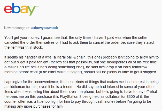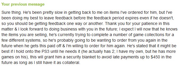 He was apparently in a hurry to get feedback (I later found out why, his "small request" was a limiter on how quickly he could get rid of me), as I had been doing this entire time when the seller was contacting me, I was keeping the buyer (my position in this sale being a middleman) in the loop, letting him know when the seller was in a hurry for it to get paid, in a hurry to cancel & re-list the item & in a hurry to get feedback. I responded with the following detailed response to let him know why I didn't have the option to leave him feedback just yet: