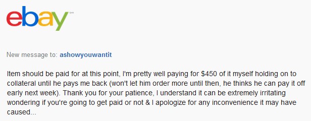 This was expected to go the same route as what happened with barrtubwel0, so I reiterated on when it was expected to be paid & cautioned him in a message sent at 2:59 PM of what will happen if he does cancel it early (using the information I got from eBay when I complained about the last early cancellation we had to deal with & giving some details about it in this response).