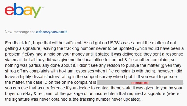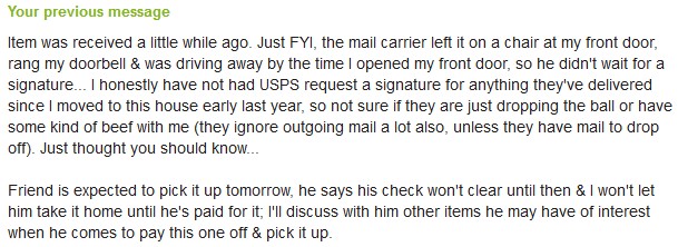After I had left the feedback, I contacted him (for what was supposed to be) one last time to let him know the transaction should be complete & he shouldn't have to worry about it anymore. I also gave him details regarding the complaint I filed to USPS about the mail carrier not getting a signature so he could follow up on it if he choose to, considering the tracking number for that package still is reading that the package hasn't been shipped yet: