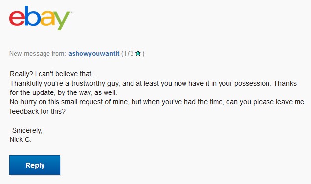 Then shall we get into the matter of honesty? ashowyouwantit thanked me a few times for being honest, however my honesty only kicked me in the butt when he decided that being a middleman took more precedence over being honest. Consider the fact that the postal office did not get a signature from me & the tracking number never updated, what was stopping me from just reporting to eBay that the item never came? If I had known ashowyouwantit was going to pull this, would have I just filed the claim that it never came because USPS screwed up, didn't get the signature & that left me the opportunity to take advantage of their lack of commitment to do their jobs? No, I wouldn't have. As much as I would have liked to knowing that this was the response I was going to get for being an honest individual, I would not have & that's because I was brought up to be an honest person & will tell the truth even if the truth would get me in trouble. I get enough abuse from my father for being straightforward, not leaving out details & offering information upfront; seems he'd rather I don't offer any information unless it's absolutely necessary, but even when I do attempt to take his example, it always bothers me (I would assume my father lacks a conscience). As much as I could have taken advantage of the situation & used the fact that USPS screwed up their tracking system by not getting a signature, even if I knew this was coming (which to some degree, I still expected it; seems I was right, even if I tried to look past it & give the seller the benefit of the doubt), I still wouldn't have lied about it & perhaps this is what sets individuals such as myself from others that would hide the facts that could effect how people see them in the world or online. What I can say is I wouldn't have given him positive feedback if I knew this was coming.