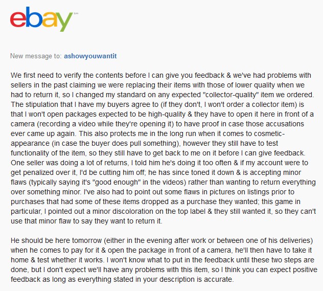 A bit more detail regarding the claims stated before had to do with sellers leira921 & coach-hines, where both tried to play the card that the item was switched to avoid having to pay back returns. leira921 in particular not only manipulated the seller protection policy with eBay, he also committed insurance fraud with USPS, so that one in particular should really be sitting in jail, if not just avoided by ebay buyers altogether... In one case I had a seller that actually turned out to be a good one, we didn't have to return the package, apparently it was covered by both buyer & seller protection by eBay, where we both got paid & the item didn't have to be returned; that seller was happy he got his money back (after a temporary hold), but a little peeved we got to keep the game and get the money back, so I sent him back part of the money (approximately a 3rd of the price, I kept a small portion from what was given back to the buyer seeing as he hasn't been paying me markup fees since I started doing this for him & he had the game to resell anyways) directly through Paypal after eBay had completed their part on the return. In one other case, things got stalled & eBay forced a return of the money from the seller; I felt guilty that the stall on my part caused it to happen & I paid back the seller the entirety of refund & gave him positive feedback, as the item did still come late, but it was originally reported as not getting received.