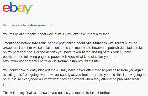 So as stated before, he was waiting for the feedback only so he could cut loose & throw his attitude in my face. It was at this point I contacted the buyer to let him know that I was going to have to place the seller on my blacklist, he obviously wanted to get some further items from this seller, but I pointed out that even if I didn't have him on my blacklist, the block put in place by the seller (while I haven't checked this, I think it's pretty obvious it's happened, so I'm not going to bother checking) wouldn't allow me to purchase from him anyways. This goes back to the complaint I filed with eBay regarding one of the other problem-sellers on eBay, where this constant shit is slowly making my account lose it's purpose & I'm getting near to the point I'm ready to close it anyways (the only reason I still had one seeing as I don't do much on eBay myself is because I do occasionally purchase from Half.com, however lately I've been purchasing more from Amazon and both of these details were stated in that complaint).