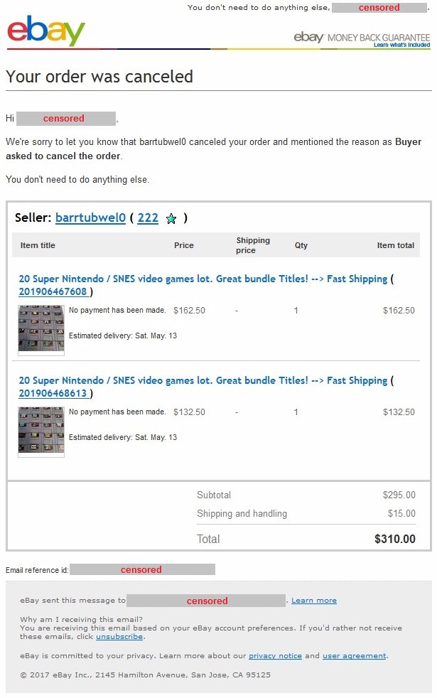 I won't be leaving negative feedback for the time being, but that's still an option if things continue to escalate; I have however written a seller review about this on my personal site. I took more of an issue with this situation due the false reason for cancellation of the order & this is explained in detail at http://www.wondergamer.net/blacklists/ebay_barrtubwel0.htm . I don't expect it will be removed, however there's still that possibility if things get resolved, not that I expect they will be because it think this matter is beyond the point where it can be resolved, especially since you have already relisted the items & will likely be grabbed before I get the money from my seller (he estimated after 2:20 PM today with the additional $40 I was going to forward him, still would have been before you were intending on shipping it) to reorder them via Buy It Now, however I sent him a text when I noticed the cancellation & he probably won't be coming now.