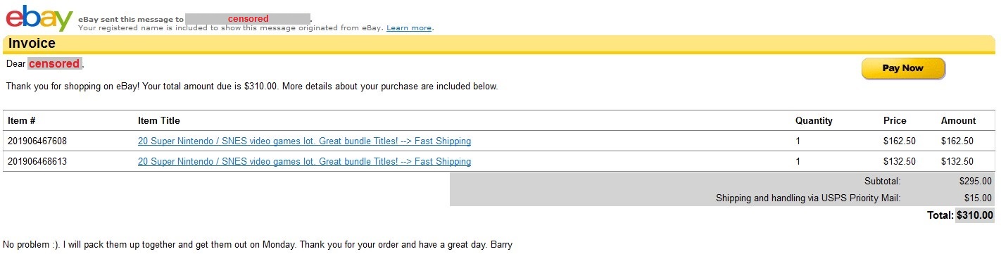 The outcome of this call was that seeing as the invoice was canceled, there was nothing that could be done about it on their end; I could try to work it out with the seller, however I find that highly unlikely, especially after throwing this review in his face, but he broke eBay ToS, I'm going to let potential buyers know about it to avoid him if they don't want this kind of conceited attitude towards tardy payments. The other thing the representative stated was that seeing as it was canceled within the first 72 hours (time allotted by eBay to receive payment; in reality, it was canceled within the first 18 hours, really only 3 hours after the contact back about merging the shipping), his account has already been penalized for canceling the order, regardless of the reason he gave.