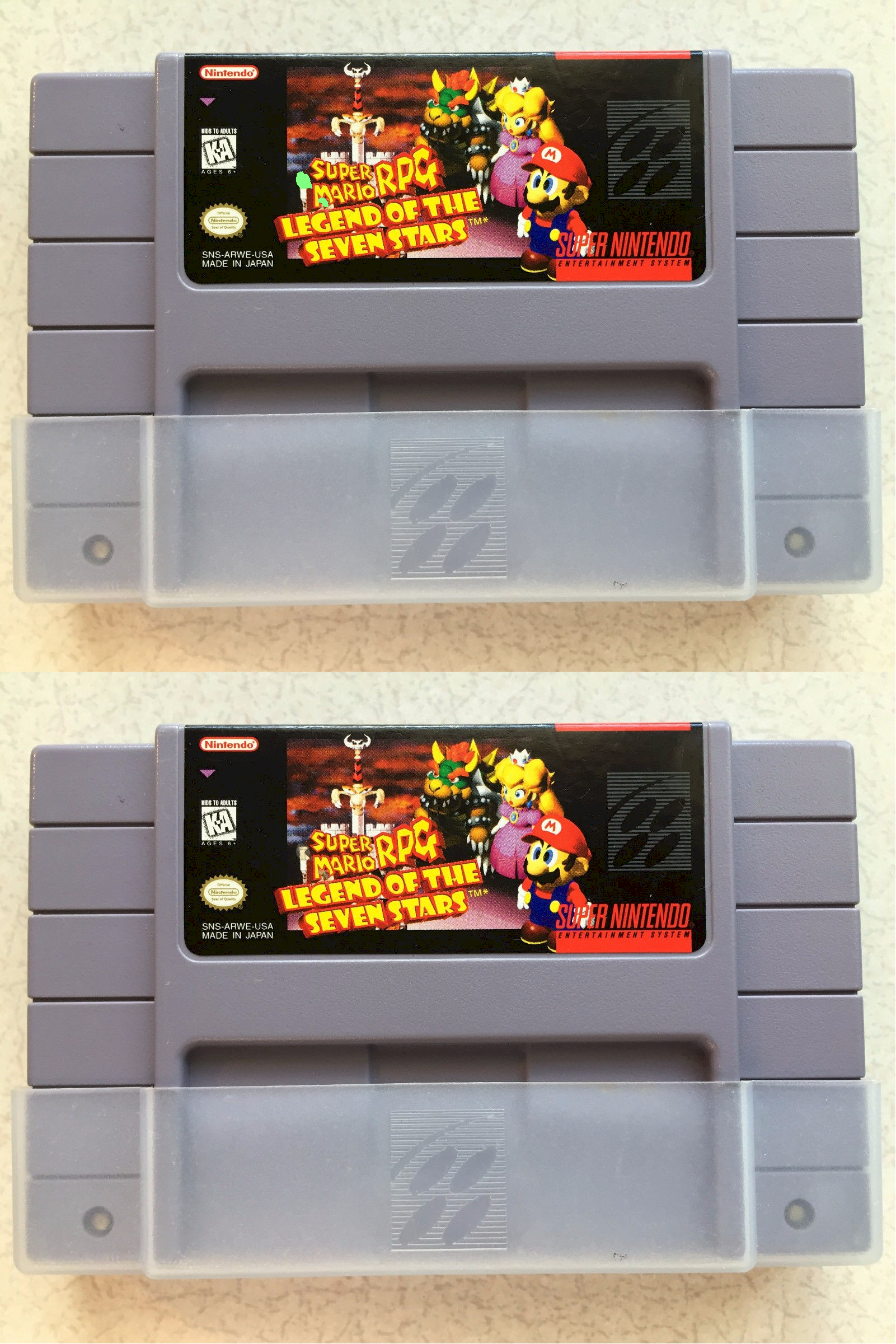 As for the seller stating that the damage is not shown in the photo, I have downloaded the photo on the listing & highlighted the damage (highlighted in light green around the S & M of "Super Mario"; this was done pixel by pixel in Microsoft Paint while being zoomed in at about 600%, causing the top-half to be less quality than the original), then put the two photos top to bottom in a comparative fashion to point out the damage. My buyer has stated that the top-left flaw was simply a smudge & was able to clean it off, but the bottom-right flaw was an actual rip in the label & apparently the reason why he's still pursuing some kind of monetary reimbursement.
