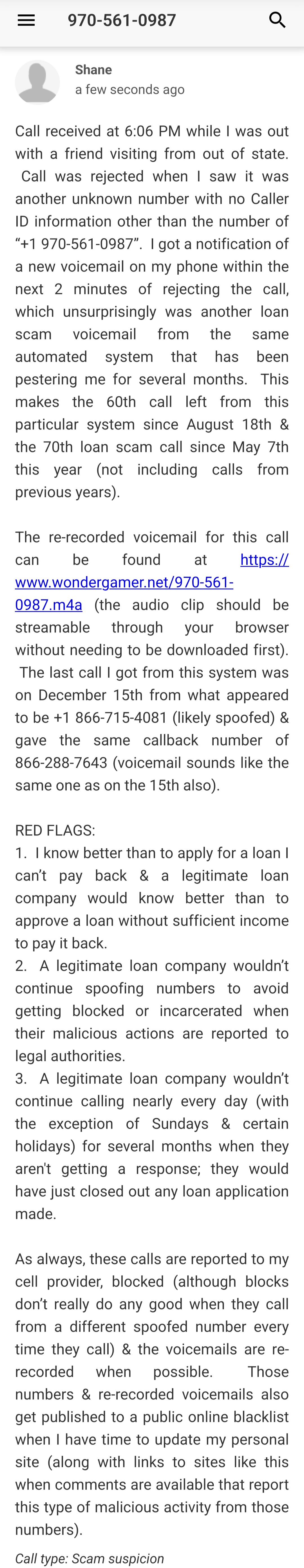 | Loan Scammer: | Calls claiming you've been pre-approved for a loan or that you've been approved for a loan that you may not have applied for. This is a VERY AGGRESSIVE scam that utilized automated systems & utilizes spoofed numbers to avoid being blocked or incarcerated over their actions, often times providing a callback number that can change almost daily (given these calls can be received almost daily & can't be functionally blocked). |