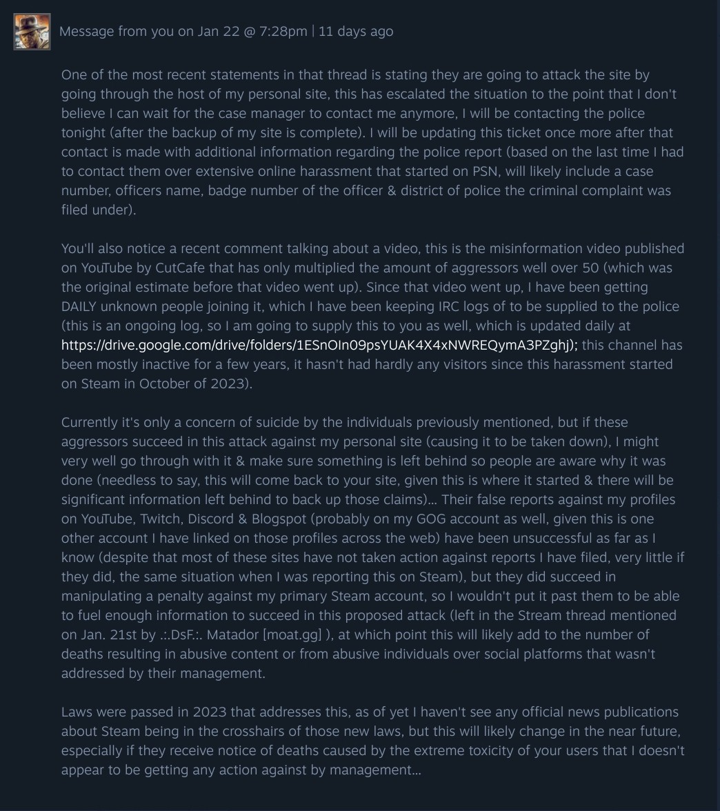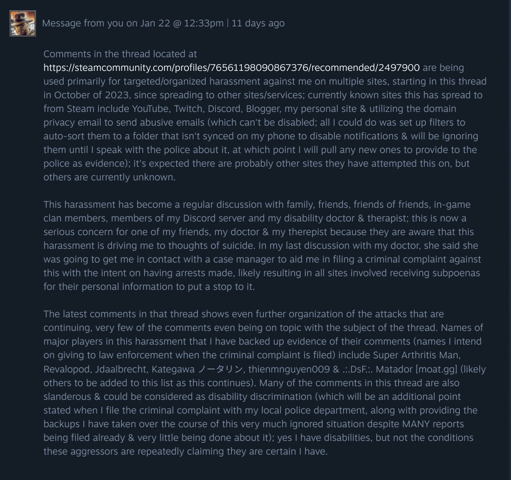 On January 22nd, I ended up contacting the police regarding this matter (this was a rushed decision due to a statement of organized attacks against this site in the thread where this started, no longer willing to wait for aid from the case manager my doctor said they were going to get me in contact with). This very much ended up being a wasted effort, but I was given a case number, which was supplied to my doctor & to Steam Management through their support system (opening a support ticket with Steam regarding the thread where this mass-abuse is being organized before contacting the police). Of course even after the reply from Steam Management to that thread, I couldn't see that they were doing anything in regards to the clear organized harassment & discrimination being stated in that thread.