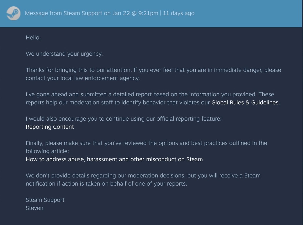 Ultimately the lack of action that this situation still stands on holds my stance of the dangers of being a customer of Steam, especially when it can start on Steam & extended well beyond their ability to even put a dent in the escalation of the actions of their most toxic users (especially if they don't act on it quickly when a report is filed).