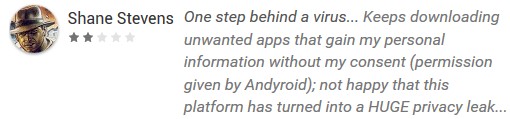 Directly after making the following statement on the Andyroid app in the Google Play store, I got 3 apps force-downloaded, installed & ran on my installation of Andyroid. For this reason, I'm going to start logging how many apps get downloaded & ran every time it happens so people are aware of just how bad the situation is: